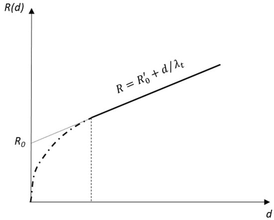 The standard EN 12939 [] and the document CEN/TR 131 [] describe the effect of thickness on thermal conductivity measurement. Figure 1 illustrates the relationship between thermal resistance and specimen thickness for various thermal insulation materials. The extrapolation to zero thickness, R0, of the straight portion of the graph depends on material properties and testing conditions []. The thickness indicates the beginning of a straight portion of the plot of thermal resistance.