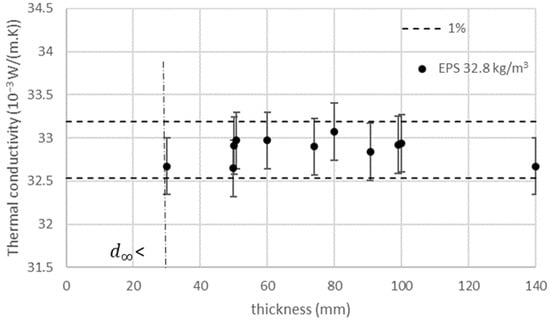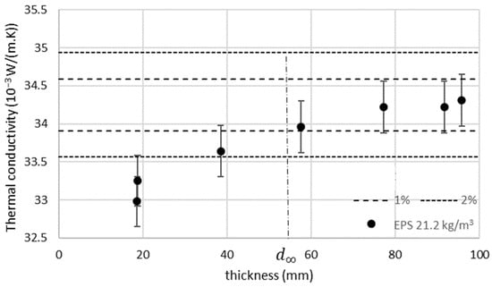 A study made by Blazejczyk [] shows that, for white EPS having a thermal conductivity of 0.040 W/(m·K) and a density of 16.9 kg/m3, the thickness effect is lower than 2% for thicknesses above 40 mm. On grey EPS having a thermal conductivity of 0.0314 W/(m·K) and a density of 14.6 kg/m3, the thickness effect is lower than 2% for thicknesses above 7 mm.