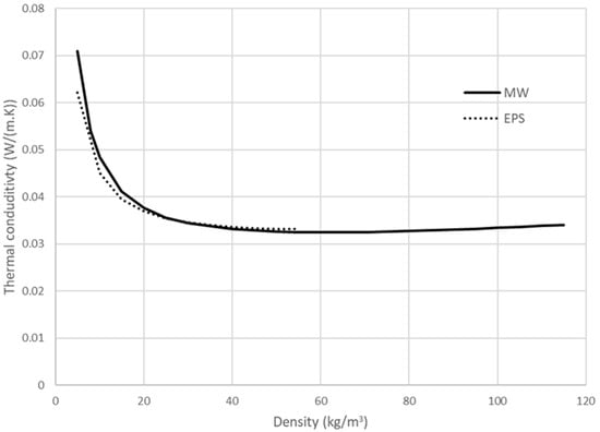 For mineral wool and expanded polystyrene, the thermal conductivity as a function of density can be modeled by the following relationship: