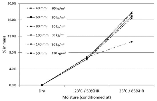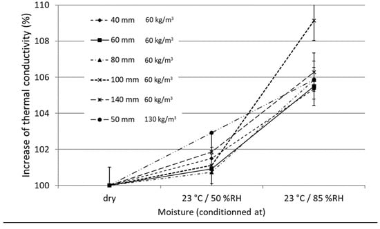 A study [] was conducted on wood fiber products with densities ranging from 60 to 130 kg/m3 conditioned in different environments. The increase in moisture content from a dried state (specimen dried at 70 °C until reaching mass constant) to a wet state (specimen conditioned at 23 °C with 50% RH and 95%RH) resulted in a water intake of from 7 to 20% of the total mass (Figure 6). This moisture increase led to a rise in thermal conductivity of from 2% to 10% compared to the dried state (Figure 7).