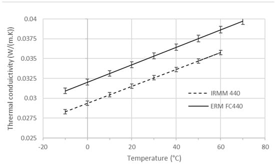 The thermal conductivities were measured between −10 °C and 50 °C or 70 °C, depending on which reference material was used, IRMM 440 or ERM FC 440. The evolution of thermal conductivity with the temperature is close to a straight line for both materials, which is what is expected in this range of temperatures. In Europe, the thermal conductivity of insulation materials for building insulation is mainly determined at 10 °C. The ERM FC440 shows a thermal conductivity higher than the IRMM 440 due to its higher density. However, the ERM FC400 is also thinner than the IRMM 440, which may fall below the specification of some lambda meters. Table 12 lists the main characteristics and Figure 8 shows the thermal conductivity of both materials as a function of temperature.