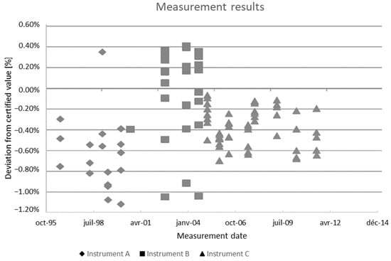 In North America, 30 round-robin tests were organized between 1986 and 2004, involving 37 laboratories. The compilation of all these measurements shows a maximum deviation between laboratories of 12% of the grand mean []. Moreover, on the last 19 rounds, 72% of measurements were within ±2% and 95.6% were within ±6%. Nevertheless, these discrepancies are not related to the materials themselves but to the overall organization of the system. Indeed, when intercomparisons are made between NIST and LNE, two metrological laboratories, one North American and the other European, the difference between the two laboratories does not allow for statistical discrimination with a difference lower than 1% between them [].