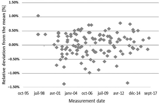 The evolution of thermal conductivity over time was also evaluated by two laboratories over a period of 14 years (Figure 9) []; no evolution of thermal conductivity was seen. Between August 2000 and October 2013, another laboratory conducted more than 100 tests at 10 °C on various Heat Flow Meter apparatuses. The deviations from the laboratory mean ranged from 1% to −1.5% (Figure 10) []. Additionally, a regression analysis of these data over time showed no significant trend at the 95% confidence level.