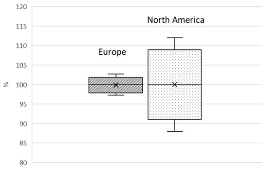When we compare the results of round-robin tests organized in two different markets, Europe and North America, the differences are significant. To perform a fair analysis, we need to take into account that the best uncertainty a guarded hot plate can achieve is 1% and 3% for a Heat Flow meter. Within Europe, several round-robin tests have been organized by the Keymark scheme for the voluntary certification of insulation since 2001. The analyses were carried out on three materials: EPS, MW, and IRMM 440. Twenty-five laboratories representing 65 pieces of equipment participated in these measurements. The maximum deviation observed since 2021 was 2.7%. Moreover, for EPS, 98.7% of measurements, and, for MW, 96% of measurements, are within ±1.5% of the mean values [,,].