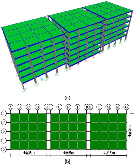 For this study, three base-isolated steel structures [] with six stories and four bays in each plan direction (Figure 1) are considered alongside a fixed-base steel structure. All stories have a height of 3.2 m, and each bay spans 5 m. All columns, except those at the four corners, are arranged in an H shape. Corner columns are rotated 90 degrees relative to the others. This pattern is observed in all building models. The superstructures use special moment frames (SMFs) and intermediate moment frames (IMFs) as their force-resisting systems, designed based on the AISC 360 [] and AISC 341 []. The seismic design of the buildings followed the equivalent lateral force procedure outlined in ASCE 7-16 []. It is important to note that, to allow for potential pounding, the design did not enforce the minimum displacement capacity requirement. Member cross-sections are presented in Table 1. In Table 1, the base-isolated buildings are named with both the type of superstructure system (e.g., SMF) and the Tb value (e.g., 2.7 s). For instance, the designation SMF2.7 would represent a base-isolated building with an SMF superstructure and a TP of 2.7 s. Type C soil conditions were assumed for the design, along with a 2475-year return period earthquake spectrum with SS = 2.37 g and S1 = 0.974 g. The steel material properties are assumed to be an elasticity modulus of 20,000 kN/cm2, yield stress of 34.5 kN/cm2, and ultimate stress of 45 kN/cm2. Dead and live loads on floors are 5.5 kN/m2 and 2 kN/m2, respectively, reducing to 4 kN/m2 and 1.5 kN/m2 for the roof. The analysis process is carried out using SAP2000 Version 25 software []. Pounding is modeled within the software using the gap link. This is a compression-only element that deactivates under tensile forces. The impact of the pounding model type on the maximum seismic response of base-isolated buildings was found to be insignificant []. Therefore, a simple gap element is used for modeling pounding. Gap links are modeled at the column-to-beam connection joints along the entire height of the adjacent buildings, as illustrated in Figure 1. The axial stiffness of the story slabs is used to represent the stiffness of the gap links []. Triple friction pendulum isolators (TFPIs) are positioned between the building and the ground level. This isolator is used in many studies [,,]. To model these isolators in the software, a triple pendulum isolator link element is employed. The design characteristics of the TFPIs are presented in Table 2. The determination of these characteristics is based on the following procedure []: