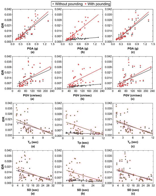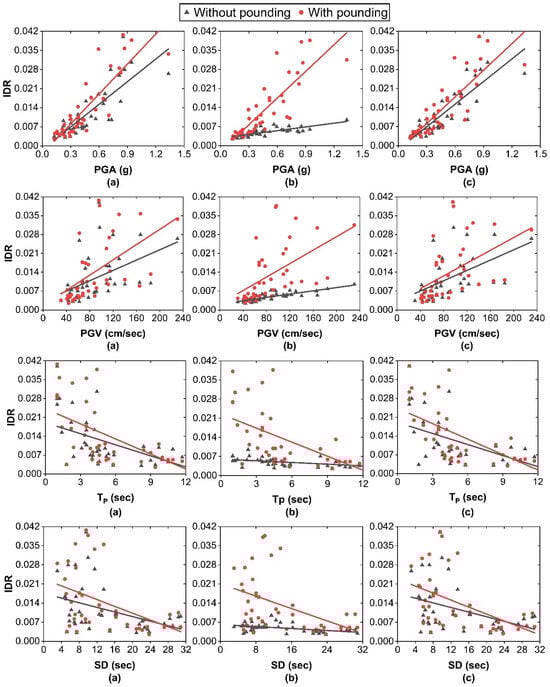 Correlation of IDR with earthquake characteristics under scenario 2: (a) left-side fixed-base building; (b) base-isolated SMF2.7 building; (c) right-side fixed-base building.