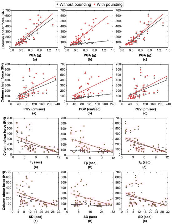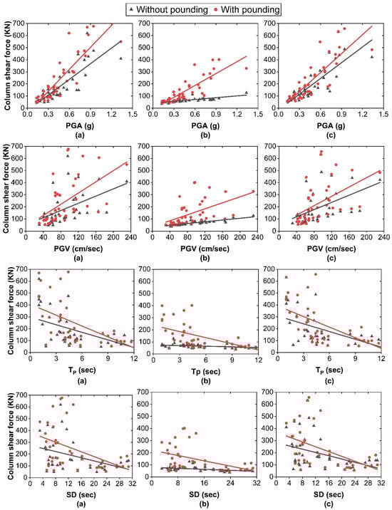 Correlation of column shear force with earthquake characteristics under scenario 2: (a) left-side fixed-base building; (b) base-isolated SMF2.7 building; (c) right-side fixed-base building.