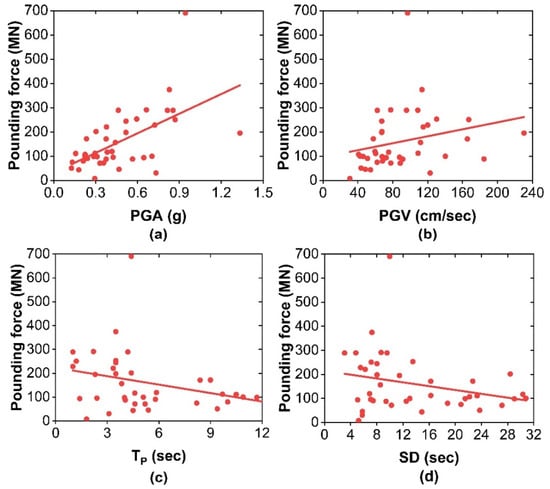 Correlation between pounding force (scenario 2) and earthquake characteristics: (a) PGA; (b) PGV; (c) TP; (d) SD.