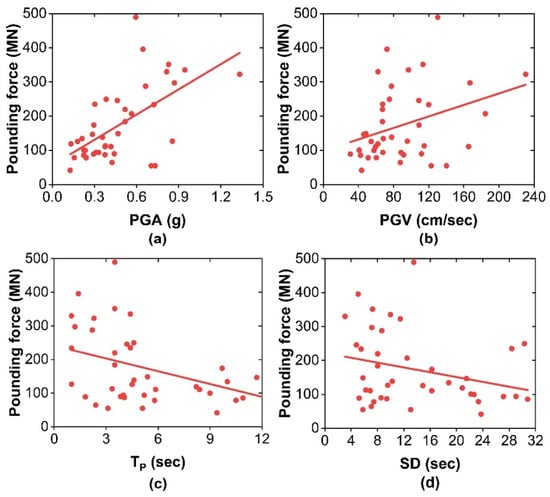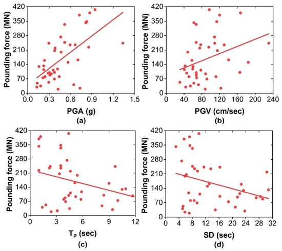 Correlation between pounding force (scenario 3) and earthquake characteristics: (a) PGA; (b) PGV; (c) TP; (d) SD.
