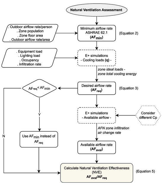 Figure 1 compiles the steps and summarizes the equations needed to verify the effectiveness of wind-driven natural ventilation based on the methodology initially proposed by Yoon and Malkawi [20]. The metric compares the hourly airflow rate of a building to the airflow that is required to offset the cooling and ventilation load. The hourly ratios of these two airflow rates are summed and then divided by the total hours. This is a function that relates the available natural ventilation flow to the required one.