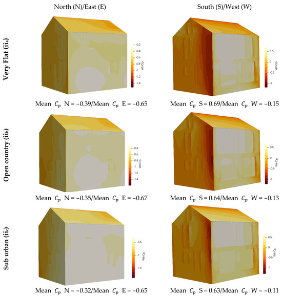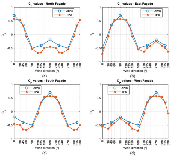 A comparison of the surface-average values investigated within the E+ AFN model, including the AIVC (iii) and TPU database (iv), is given in Figure 5. The values from AIVC are provided in a 45° range, from 0° to 315°. The reference used for the TPU database was Type C with side eaves. This model provides surface-average values in a 22°5′ interval, from 0° to 90°, so the values for other wind directions were extrapolated, considering a rectangular building. Also, the values for the considered wind directions in the study were adapted, accounting for the façade position and the incident wind used in the Tokyo Polytechnic University reference.