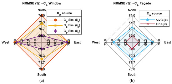 Comparison between the three sources (ii–iv) and the default values (i)—NRMSE (%). (a) Window values; (b) façade values.