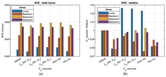 Natural Ventilation Effectiveness (NVE) is a performance metric that quantifies when outdoor airflows can be used as a cooling strategy to achieve indoor thermal comfort. Based on standard ventilation threshold and building energy simulation (BES) models, the NVE relates available and required airflows to quantify the usefulness of natural ventilation (NV) through design and building evaluation. Since wind is a significant driving force for ventilation, wind pressure coefficients () represent a critical boundary condition when assessing building airflows. Therefore, this paper investigates the impact of different sources on wind-driven NVE results to see how sensitive the metric is to this variable. For that, an experimental house and a measurement period were used to develop and calibrate the initial BES model. Four sources are considered: an analytical model from the BES software (i), surface-averaged values for building windows that were calculated with Computational Fluid Dynamics (CFD) simulations using OpenFOAM through a cloud-based platform (iia,b,c), and two databases—AIVC (iii) and Tokyo Polytechnic University (TPU) (iv). The results show a variance among the sources, which directly impacts airflow predictions; however, its effect on the performance metric was relatively small. The variation in the NVE outcomes with different ’s was 3% at most, and the assessed building could be naturally ventilated around 75% of the investigated time on the first floor and 60% in the ground floor spaces.