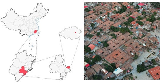 Fujian Province, located in the eastern coastal region of China, is characterized by its numerous islands and plains, with a relatively flat terrain and low surface roughness, resulting in generally higher wind speeds by 2–4 m/s, compared to inland areas. Meteorological statistics indicate that Fujian is affected by 3–7 typhoons annually, with the typhoon season concentrated between July and September. The increasing frequency of severe typhoons poses significant threats to residential and architectural safety in the region. The traditional villages of Fujian are renowned for their unique spatial layouts and architectural features, reflecting the area’s rich cultural heritage and historical value. These village layouts often demonstrate a respect for nature and ecology, emphasizing the belief that humans are an inseparable part of nature []. The spatial distribution of traditional Fujian villages is cohesive, with a clear emphasis on aggregation [].