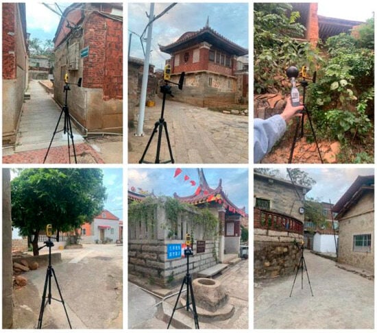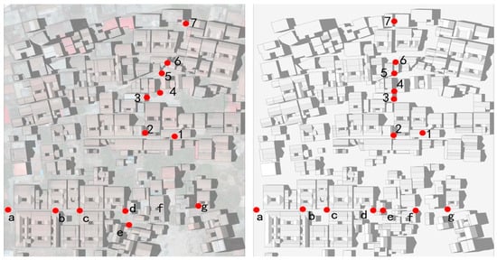 Due to the limited number of instruments, the mobile measurement mode was used. First, the instrument was left to stand for 5 min to ensure that it was in a stable condition. After that, six readings were taken at one-minute intervals at each measurement point, and the average value was taken as the measurement result of that point. One round of data collection was completed every hour, and nine rounds of sampling were repeated throughout the day in total. The instrument was operated in strict accordance with the relevant technical specifications and was placed at a height of 1.5 m from the ground, away from objects that might obscure the data to avoid affecting the data collection. All raw data were recorded on the spot and photographed for subsequent processing and analysis (Figure 2). The monitoring points were strategically arranged along two main roads that ran perpendicular and parallel to the primary orientation of the village buildings. The vertical points were numbered from 1 to 7, and the horizontal points were lettered from a to g. This arrangement was designed to comprehensively capture variations in wind speed caused by the distribution of buildings, thereby providing empirical support for evaluating the wind environment regulation effects of the “maze-like” architectural layout. The layout of the monitoring points considered the ventilation paths within the village and the gaps between buildings to ensure accurate recording of wind conditions.