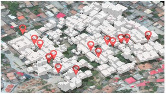 In addition, the study utilized a DJI RTK350 drone for oblique aerial photography to generate a triangular mesh model for use as a reference in modeling. Based on the spatial data obtained, the site’s three-dimensional model was simplified and reconstructed using the SketchUp 2019 software (Figure 3). The model was then imported into PHOENICS for numerical simulation, and the results were compared with those from field monitoring to validate the reliability of the model and software settings.
