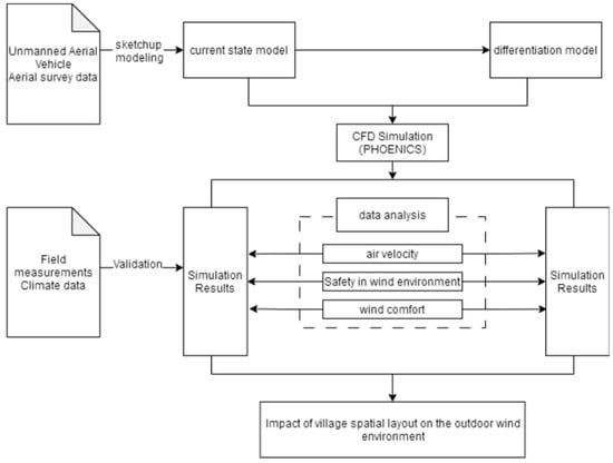 In this study, we developed a “divergent model” by maintaining the original structures of individual buildings but reorganizing them into a more standardized order. Alienation modeling, a method used here, involves crafting a modified version of the existing spatial arrangement to evaluate the theoretical effects of changes in structure and layout. Specifically, this study reconfigured the traditional, irregular layout of a village into a more systematic pattern, enabling a comparative computational fluid dynamics (CFD) simulation of wind dynamics under both conventional and modified conditions. This approach provided valuable insights into how various architectural layouts influence the management of environmental forces, such as wind. The divergent model was created by transforming the traditional village’s nonlinear roads and layout into a regularized format. This was achieved by straightening the two main roads while keeping the original building positions intact, thereby enhancing wind circulation. This model served to assess the potential impacts on the overall wind environment resulting from modifications in road layouts without altering the building structures.