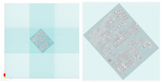 After converting the existing village layout model and the regularized divergent model into the STL format, they were imported into PHOENICS. The simulation parameters were set based on the actual dimensions of the study area, with the height of the computational domain being three times that of the tallest building and the width being five times the planar dimensions (Figure 6).