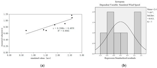 Furthermore, the p-value was less than 0.006, confirming that the linear regression analysis was statistically significant (Table 2). Additionally, the normal distribution of residuals, as shown in the histogram (as depicted in Figure 7b), indicated a good fit of the model. These results support the use of the PHOENICS model to simulate the wind environment in outdoor spaces and further validate the effectiveness of CFD simulation data in analyzing the spatial dynamics of traditional village squares.