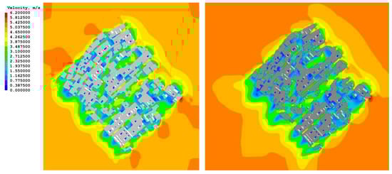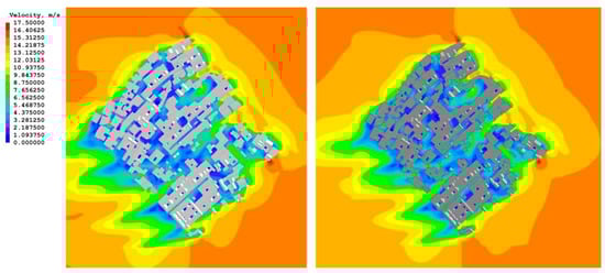 Subsequently, numerical simulations were carried out by importing the two models into the PHOENICS 2016 software and setting the same environmental boundary conditions. The results of the two simulations were compared to analyze the effects of the changes in building layout on the wind speed distribution and wind flow field at the site (Figure 5).