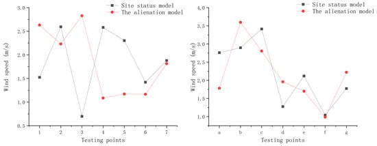 By comparing wind speeds at the same numbered monitoring points under different layouts, further insights into the environmental differences between the two models were revealed. Internal monitoring points (1, 3, and 7) experienced significantly higher wind speeds in the divergent model, indicating that straightened roads enhanced air circulation in these areas. However, for points located within building clusters (4, 5, and 6), wind speeds actually decreased in the divergent model, likely due to the straightened road layout creating new wind barriers formed by the surrounding buildings, which impeded airflow. Additionally, significant increases in wind speeds at edge points (b and h) in the divergent model reflect the effect of unobstructed straight roads on accelerating wind speeds, which could lead to decreased comfort in the winter (Figure 9).