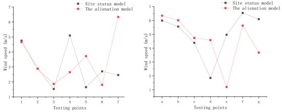 Specifically focusing on wind speeds at designated monitoring points, for example, at monitoring point 7, the wind speed in the current model was recorded at 2.46 m/s, whereas in the divergent model, it reached 6.33 m/s. This significant increase indicates that in traditional layouts, numerous obstacles and non-linear roads effectively reduce wind speed, enhancing risk prevention capabilities. Similarly, at monitoring point a, the wind speed in the current model was 5.99 m/s, increasing to 6.34 m/s in the divergent model. These data further confirm the impact of straightened roads on accelerating wind speeds (Figure 11).