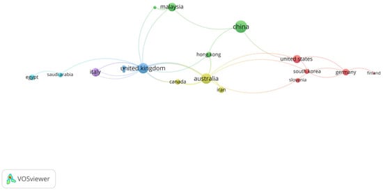 The use of 5D BIM in the construction industry and related research has distinct characteristics in different countries and regions. An analysis of the locations in which the articles were published can therefore provide insight into the most influential outlets of this research, international collaboration, and academic status []. The nations with the greatest number of 5D BIM publications in the construction industry are shown in Figure 4, based on bibliometric studies from Scopus. Data from 52 countries were analyzed using VOSviewer 1.6.20. The colors in the country co-occurrence analysis typically represent different groups of countries that have similar patterns of collaboration or research focus. These groups are formed based on the strength of co-occurrence links between countries. Figure 4 highlights the important association between Australia and the United Kingdom, showing that strong links may exist between different countries as a consequence of regional collaboration networks.