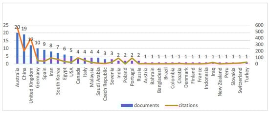 Based on the results from WoS, 35 countries and regions were identified, as displayed in Figure 5. Australia stands out as the country with the most publications, with a total of 20, and also the highest number of cited articles on 5D BIM in the construction industry, with a total of 562. China and the UK follow closely, with 19 and 12 relevant articles, respectively. Publications in the UK had a higher number of citations (390) than those in China (200). The quality of the publications of these three countries is superior to those from the other countries, as evidenced by the higher numbers of citations. Germany was the next best, with ten articles, followed by Spain, Iran, and South Korea, each contributing nine, eight, and seven articles. For India and Portugal, the number of publications was only two, but with 89 and 90 citations, respectively. The outputs of Australia, the UK, and China can also be seen to be similar to one another in Figure 5 below, which shows that research collaborations are active, especially between the UK and Australia, as indicated by the thicker connecting line.