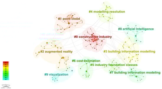 Clustering is a common and valuable approach in SLRs, as it helps to categorize and synthesize large volumes of information into meaningful groups. This method allows us to identify patterns, trends, and relationships within data, which is particularly important for understanding complex topics such as 5D BIM adoption. Through the use of clusters, this research can carry out a structured and comprehensive analysis, making it easier to highlight the critical factors and their interconnections within the research field. This approach directly relates to our research objective of synthesizing the existing literature to identify and understand the key factors influencing 5D BIM adoption and project performance. Cluster analysis involves comparing data or information with similar attributes. Rather than relying on a standard conspicuous grouping network, CiteSpace, v.6.2.R6 (64-bit) Advanced provides accurate visualizations of clustered data, and highlights the attributes of clusters by assigning labels based on their size; the cluster density may also be indicated in the graph area [,]. Ten categories were used to group the terms in the CiteSpace v.6.2.R6 (64-bit) Advanced analysis report. Figure 11 shows the frequency of the terms within each cluster, where a wider range indicates more occurrences of the relevant keyword.