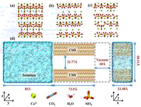 (a–c) show the initial unit cells for models with C/S = 1, C/S = 1.5 with non-bridging silicate–oxygen, and C/S = 1.5, respectively. After undergoing Monte Carlo simulations for water absorption to saturation, the cells were expanded, and selected atoms were removed to form pore channels. A water box containing CO2 was then placed on the left side of the pore channel to create the C-S-H pore transport model, illustrated in (d).