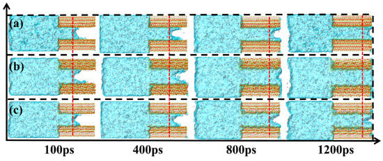 Figure 2 illustrates the migration of an aqueous solution containing CO2 from the solution system into CSH pores with Ca/Si = 1, Ca/Si = 1.5 (no bridging silica–oxygen), and Ca/Si = 1.5 configurations over a duration of 1500 ps. Notably, the leading interface of the solution inside the CSH nanopores adopts a distinct concave shape, and the contact angle of the liquid–solid interface measures less than 90°, indicative of the remarkable hydrophilicity of CSH. Surprisingly, Ca/Si = 1.5 (Figure 2b) exhibits the fastest transport, followed by Ca/Si = 1 (Figure 2a), while Ca/Si = 1.5 (no bridging silica–oxygen) (Figure 2c) displays the slowest transport; moreover, it was noted that at the entrance of the CSH pores, the matrix protrudes slightly, accompanied by the diffusion of silica–oxygen tetrahedra into the channels. This suggests that the transport rate of the solution within CSH pores is not solely influenced by surface structure variations due to differences in the Ca/Si ratio and the absence of bridging silicon–oxygen sites, which contributes to the instability of the CSH matrix.