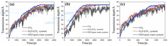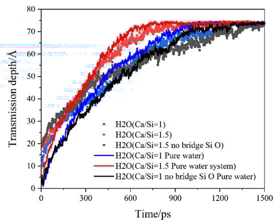 To quantitatively assess the impact of varying calcium–silica ratios and solutions, we tracked the passage of water and ions through the channels over simulation time and determined the transport depth by measuring the distance of the intermediate level of the solution inside the pore. As depicted in Figure 3, the system with CO2 initially enters the pore channel slightly faster than the pure water solution. However, in the latter half of the transport, the depth of transport is not as fast as that of the pure water system. This discrepancy may stem from CO2 gas presence, which initially accelerates solution diffusion but subsequently leads to CO2, CO32−, or HCO3− occupying adsorption sites or reacting with the substrate, thereby narrowing the pore channel and slowing solution transport [].
