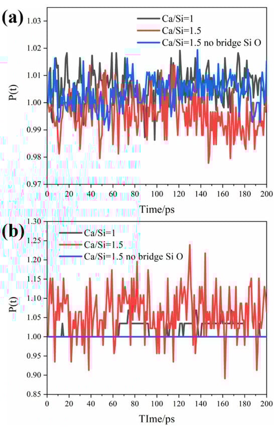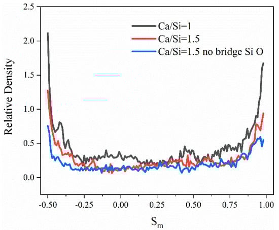 where represents the angle between the two directions of the water dipole. A Sm value close to 1 indicates high water ordering, while a value close to −0.5 suggests low ordering and a disordered state. As depicted in Figure 5, the system with a Ca/Si ratio of 1 exhibits the highest degree of water ordering, implying greater water involvement in its adsorption, followed by the system with a Ca/Si ratio of 1.5. Conversely, the system with a Ca/Si ratio of 1.5 (no bridging silica–oxygen) displays the lowest degree of ordering. This discrepancy arises from the tendency of water to adsorb onto the oxygen of the silicon chain on the CSH surface, forming stronger hydrogen bonding interactions compared to Ca ions. Furthermore, oxygen at the bridging position is closer to the surface and facilitates water adsorption more readily. Consequently, differences in the bridging position of silicon–oxygen among the three systems result in varying degrees of water ordering.