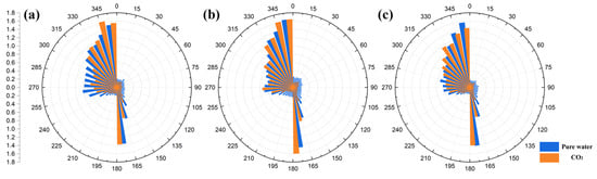 Additionally, as depicted in Figure 6, the dipole profiles of water molecules in the three systems illustrate the distribution of water in each direction. Remarkably, the addition of CO2 has minimal effect on water distribution. Given the hydrophilicity of CSH, water dipoles are predominantly distributed at angles of 180° and 300° to 360°.