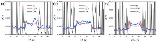 One-dimensional density distributions of Si atoms, H2O, and CO2 in the CO2 system for different Ca/Si ratios are presented as follows: (a) Ca/Si = 1, (b) Ca/Si = 1.5, and (c) Ca/Si = 2.0 (excluding bridging silica–oxygen). The density distributions were extracted from the final 500 frames of the simulation, corresponding to the time range from 1.5 ns to 2.0 ns. In these distributions, the x-axis represents the z-coordinate direction, and the y-axis shows the density within the model.