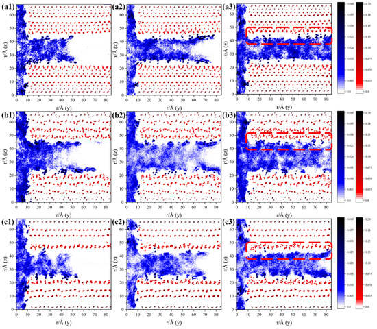 Snapshots of the transport of H2O and CO2 within the capillary channels of CSH gels in Ca/Si = 1 (a), Ca/Si = 1.5 (b), and Ca/Si = 1.5 (no bridging silica–oxygen) (c), the red line represents a vertical extension from the lowest point of the liquid level across the three models, allowing us to observe the differences in transmission depth.