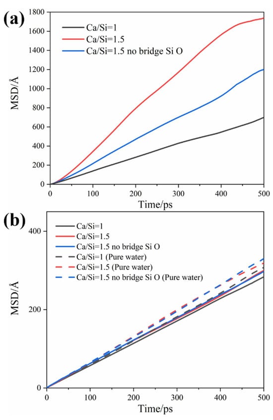 Contrastingly, in Ca/Si = 1.5 (Figure 7b and Figure 8b), the matrix appears more disordered, with carbon dioxide directly adsorbed onto the CSH matrix rather than the water layer. Both water and carbon dioxide intrude on the matrix surface, resulting in an expanded transport area. This phenomenon may contribute to the faster transport rate of Ca/Si = 1.5. However, the intrusion of water and carbon dioxide inevitably leads to significant matrix damage, the effects of which are analyzed by mean square displacement (MSD).