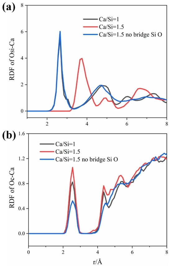 In Figure 10a, the RDF peaks of Ca/Si = 1 and Ca/Si = 1.5 (no bridging silica–oxygen) with OSi are nearly identical, with peaks around 2.7 Å. However, the peak of Ca/Si = 1.5 (unbridged silica–oxygen) is slightly higher, and its peak position is farther from the peaks of the other two systems, at approximately 3.7 Å. Additionally, its peak is wider, indicating a higher coordination number. In Figure 10b, the RDFs of Ca and OC for the three systems exhibit peaks at similar positions, with Ca/Si = 1 displaying the highest peak, followed by Ca/Si = 1 and Ca/Si = 1.5 (no bridging silica–oxygen) displaying the smallest peak. Analysis of the RDF and coordination number suggests that in the Ca/Si = 1.5 system, Ca distribution on the surface is wider, and more Ca is adsorbed by CO2. This phenomenon is attributed to the intrusion of water and CO2 on the surface of the Ca/Si = 1.5 system, weakening its Ca adsorption on the surface. Meanwhile, constant adsorption of Ca by CO2, transported along with it, results in loosely distributed Ca on the CSH surface. Conversely, in the system without bridging silica–oxygen, stronger Ca adsorption on the surface occurs due to more available adsorption sites, reducing CO2 competition for Ca.