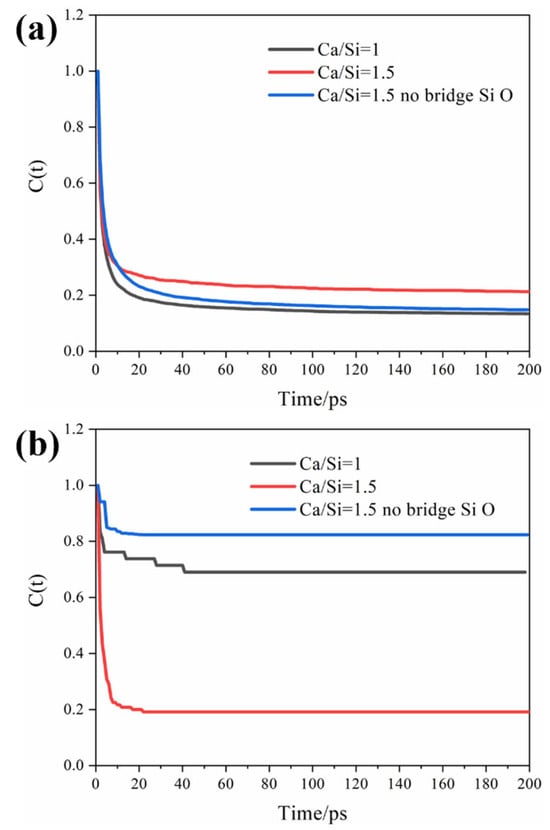 Time correlation function (TCF) of oxygen (O) and surface calcium ions (Ca) in (a) silica–oxygen tetrahedra and (b) CO2 and its hydration products for systems with three different calcium-to-silica ratios: Ca/Si = 1, Ca/Si = 1.5, and Ca/Si = 1.5 with non-bridging silica–oxygen. These plots illustrate the interaction dynamics and stability of surface calcium ions with oxygen in the C-S-H matrix under CO2 exposure.