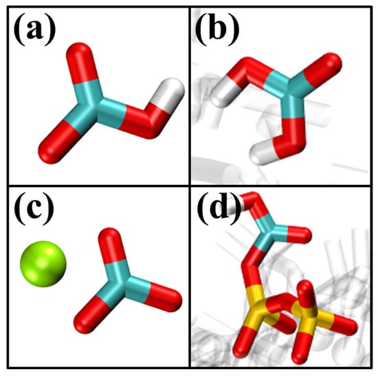 Reaction of bicarbonate ions (HCO3−) (a), carbonic acid (H2CO3) (b), calcium carbonate (CaCO3) (c), and carbonic acid with CSH substrate (d) in three calcium-to-silica ratios within the CO2 system, as well as Ca/Si = 1.5 and Ca/Si = 1.5 (no bridging silica–oxygen).
