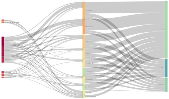 The first visualisation of the bibliometric results shows the predominance of Scandinavian countries, especially Finland, in scientific production and their strength as forestry nations (Figure 1). This is seen not only in the authors’ or their academic institutions’ countries but also in the places where they study the link between timber, construction, and society (as seen in the main topics of these articles). The analysis also reveals that around 40% of the chosen articles relate to the five journals that have the most relevance in terms of quantity, and some of these journals appear again when looking at the sources that these articles cite the most. A similar pattern emerges when examining the articles, where the three most widely cited articles also cluster the references within the restricted group of the 43 chosen (Table 1). This indicates the consolidation of a body of knowledge developed with a certain degree of autonomy and likely employing established and common approaches and methodologies.