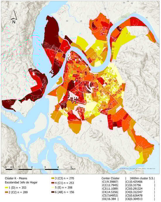 Cluster analysis based on the head of household education index with six representative clusters of the socioeconomic levels in Valdivia.
