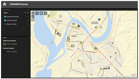 With the described results, an online map resource was generated to facilitate the random selection of blocks where cases will be surveyed for each cluster and replacement blocks chosen randomly and used if the original blocks are unsuccessful (Figure 3). Each record also includes the details of the households and their corresponding classification, allowing the surveyor to verify their location and the situation of the selected block. The survey was carried out in November 2023 and involved 96 households and 24 blocks, considering four selected households per block on average (Table 5). Three field interviewers surveyed people. When the originally selected 24 blocks had no available households, adjacent replacement blocks were used. This was primarily seen in areas with a high presence of informal settlements and difficulty of access.
