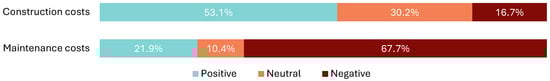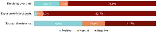 The descriptive analysis offers an initial insight into end users’ perceptions of various aspects of wooden construction, as outlined in the survey dimensions. Depending on the wording of the questions, the Likert scale responses convey different viewpoints on the aspects in question, leading to perceptions being categorised as positive, neutral, or negative. For example, regarding the durability of wooden construction, most respondents express concerns about the exposure to insects (typically termites) and, to a somewhat lesser extent, about its long-term resilience (Figure 4). However, in the case of structural strength, the results are more evenly split, with nearly equal positive and negative perceptions. Similarly, the perception of costs associated with wooden construction yields expected outcomes, with predominantly positive views on initial investment costs but some reservations about maintenance expenses over time (Figure 5).