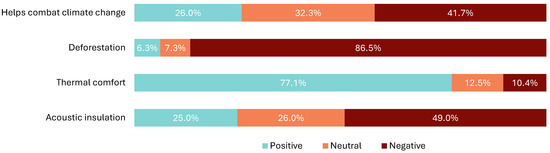 On the other hand, fire resistance presents a very high percentage of negative perception, highlighting one of the most widespread and cross-cutting fears of wooden construction: that it burns easily. However, a significant percentage also believes that the fire risk in a wooden house can be technically resolved. This opens up possibilities to reverse one of the arguments against wood, likely more entrenched in the collective imagination, through information (Figure 6). Conversely, one of the most significant findings of this study is the emergence of a negative perception in one of the areas that constitute the strength of wooden construction: its sustainability. Indeed, while the results show an expected positive perception of thermal comfort, especially in a country with low energy performance standards, a very high percentage indicates that wooden construction causes deforestation (Figure 7). This initially seems counterintuitive since it is based on wood stocks from forest plantations. Still, the contradiction is exacerbated by 42% of respondents’ perception that wooden construction does not contribute to combating climate change. This may be concerning as a phenomenon from a forestry country, even contradicting most of the literature, which generally expresses positive perceptions of wood regarding sustainable construction. However, some articles raise concerns about forest management practices as a prerequisite for accepting wood as a construction material [30]. However, to better understand what type of user represents this view, it is necessary to delve into the exploratory analysis.