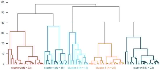The dendrogram suggested grouping the observations into clusters with similar features and distinct sociodemographic profiles (Figure 8). Five clusters were identified (Figure 6), which can be described by the following characteristics (the percentages in parentheses show the frequency of responses given):