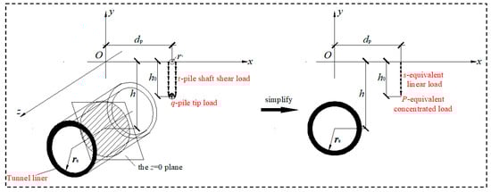 This paper presents a simplified version of the engineering issue of tunneling through pile foundation, which is referred to as the plane strain problem. Figure 1 illustrates the theoretical simplification of engineering difficulties that are encountered in practice. In order to obtain the plastic region range of the stratum under the combined action of tunnel construction and piling load, the idea of superposition is applied, and the procedure of calculation is presented in Figure 2. To begin, the thin-walled theory is utilized to derive the stratum stress that is created by tunnel construction. This tension is derived by taking into consideration the impact of the tunnel structure’s stiffness. Additionally, the stratum stress that is generated by the pile foundation (i.e., pile shaft shear load and pile tip load) is superimposed on the stratum stress that is created by the building of the tunnel. Finally, the equation describing the envelope of the potential plastic region caused by tunnel building near a piling foundation is determined using the Mohr–Coulomb criteria.