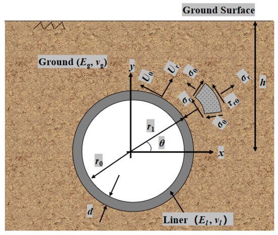 The theoretical analytical model of the tunnel liner and ground is depicted in Figure 3. In this model, the cartesian coordinates x and y are considered, whereas the polar coordinates r and θ are considered elsewhere. In this equation, the variable h represents the buried depth of the tunnel, Ur and Uθ represent the radial and circumferential displacements of the soil, and σr, σθ, and τrθ represent the radial, circumferential, and shear stresses of the soil, appropriately. The liner thickness is denoted by the letter d. As far as the liner is concerned, the outer radius is denoted by r1, whereas the inner radius is denoted by r0. Eg and νg are the abbreviations for the elasticity modulus and Poisson’s ratio of the ground. El and νl are the elasticity modulus and Poisson’s ratio of the liner, respectively.