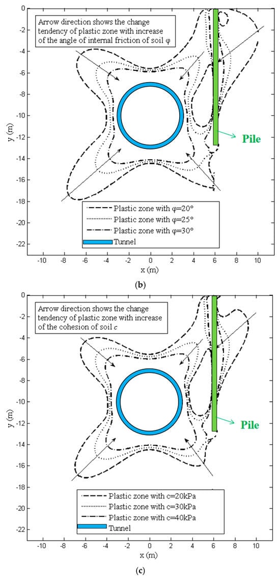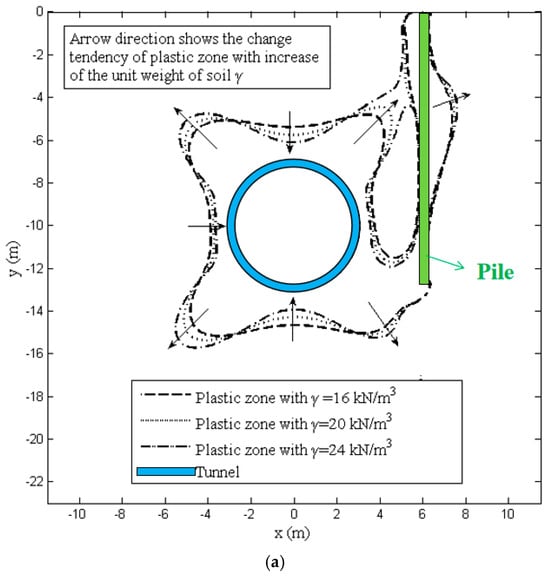 The impact of three distinct soil unit weight magnitudes (γ = 16 kN/m3, 20 kN/m3, and 24 kN/m3) on the outlines of the possible plastic regions is shown in Figure 6a. The plastic region’s tendency to alter as soil unit weight increases is indicated by the arrow direction. The findings show that when the soil unit weight grew, the potential plastic region’s limits somewhat shifted. The potential plastic region’s four corners stretch outward, while its midpoints on each side contract inward, indicating that as the soil unit weight increases, the prospective plastic region’s shape will progressively take on the form of a butterfly. Additionally, when the tunneling-induced potential plastic region expands, the two potential plastic regions near the tunnel and the pile merge.