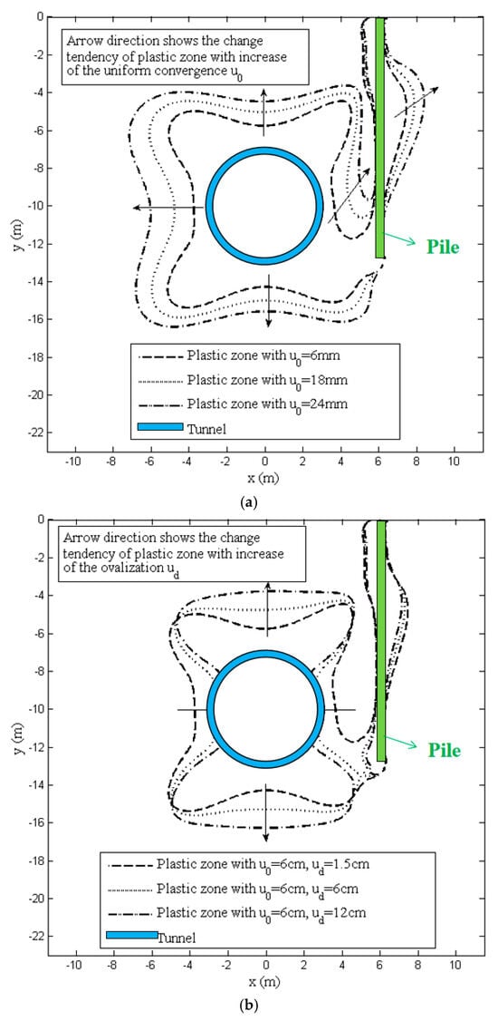 Figure 7a illustrates the effect that three unique uniform convergence magnitudes (u0 = 6 cm, 9 cm, and 12 cm) have on the borders of the potential plastic regions. These magnitudes are shown in the graphical representation. The observations suggest that the morphologies of the potential plastic zone change slightly and take on a butterfly-like appearance as the concentration of uniform convergence increases. Conversely, as the uniform convergence increases, the possible plastic region’s ranges greatly increase.